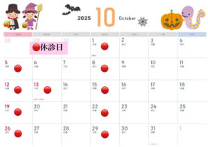 2025.09.29 10月の診療カレンダー みずたま歯科クリニックの10月の休診日のお知らせです🎃 朝晩はグッと肌寒くなってきましたね🍂 季節の変わり目で体調を崩しやすい時期かと思いますので、気を付けてお過ごしください✨ また、お口の中を清潔に保つことは感染症予防にもつながりますので、ぜひこの機会にお口のチェック&クリーニングを受けていただくのがおすすめです☺️ 10月もよろしくお願いします🥰
